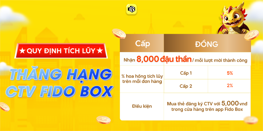 Điều kiện: Các bạn chỉ cần mua thẻ đăng ký CTV với 5,000 đồng trong cửa hàng trên app Fido Box là có thể thăng hạng lên cấp đồng