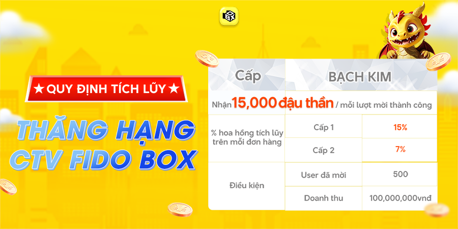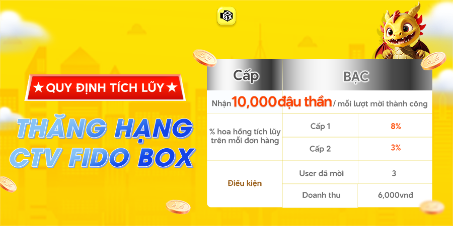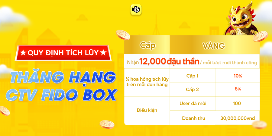 Fido Box vừa ra chương trình cộng tác viên và thêm quy định thăng hạng cộng tác viên Fido Box dành cho các bạn cộng tác viên muốn hợp tác với Fido Box. Có 5 cấp