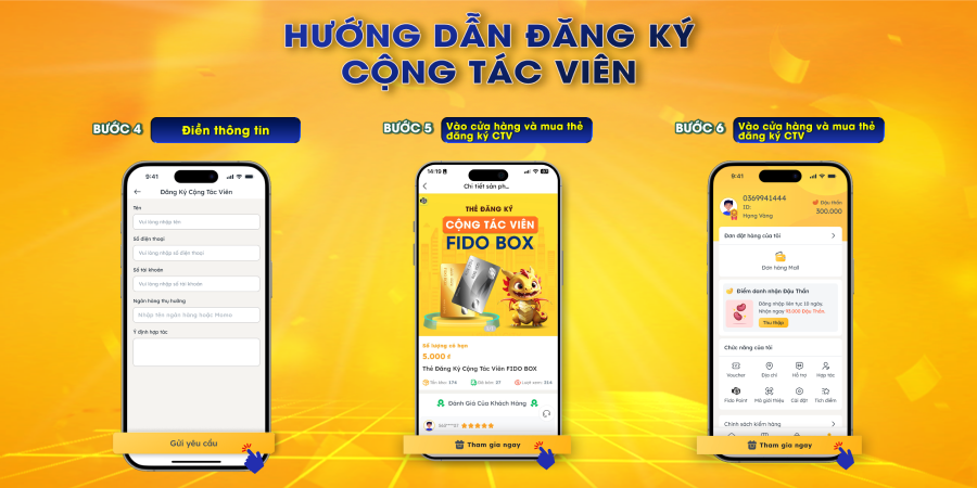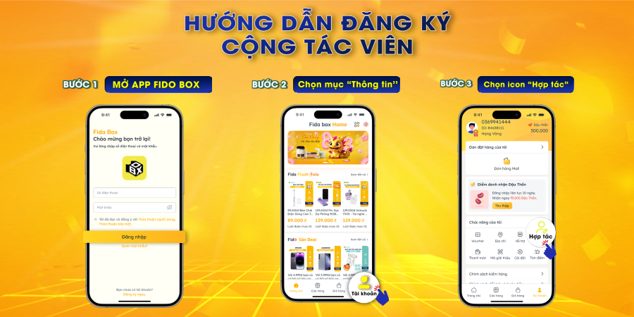Dưới đây là các bước hướng dẫn các bạn đăng ký cộng tác viên trên app Fido Box một cách dễ dàng