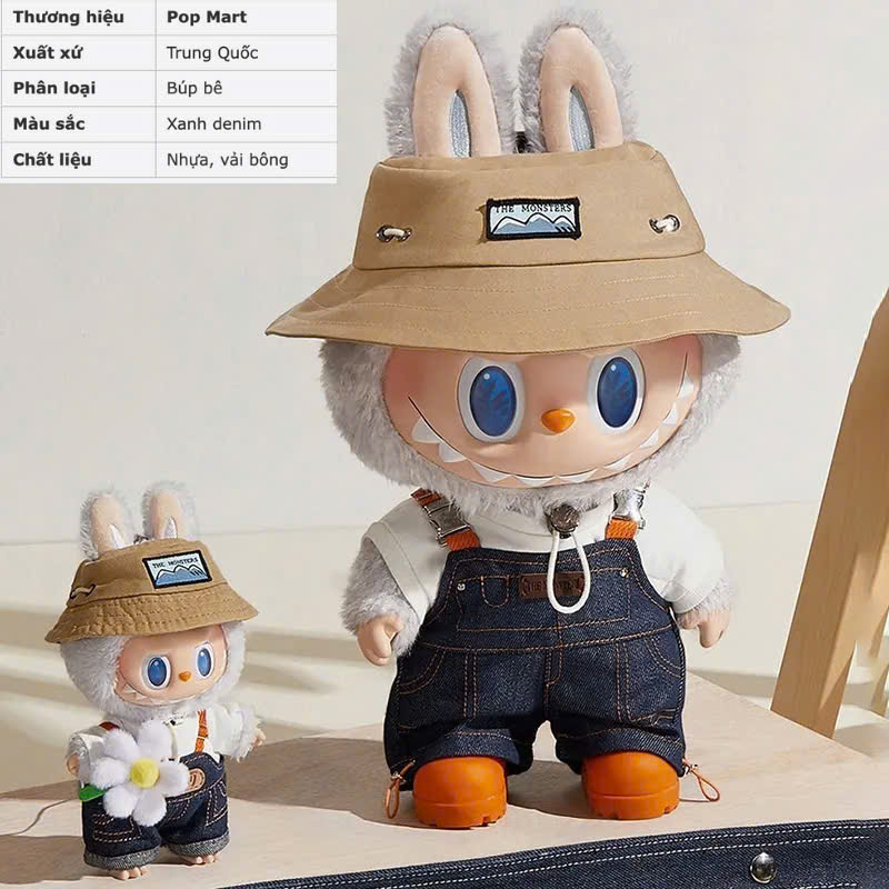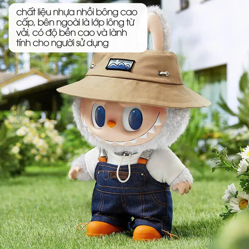 • Búp Bê Labubu có thiết kế rất đáng yêu, mô phỏng hình dáng nhân vật Labubu của Vương quốc Quái Vật được khắc họa với biểu cảm khuôn mặt dễ thương với đôi mắt to tròn và nụ cười tinh nghịch trong trang phục áo màu trắng và yếm denim, đội mũ năng động.