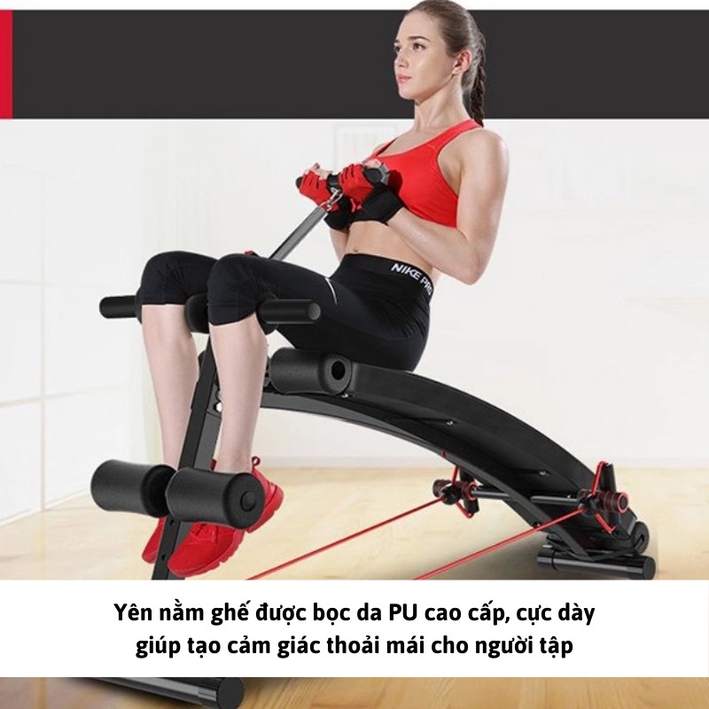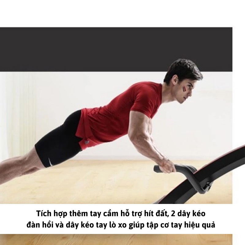 - Ngoài ra ghế còn tích hợp thêm tay cầm hỗ trợ hít đất, 2 dây kéo đàn hồi và dây kéo tay lò xo giúp tập cơ tay hiệu quả.