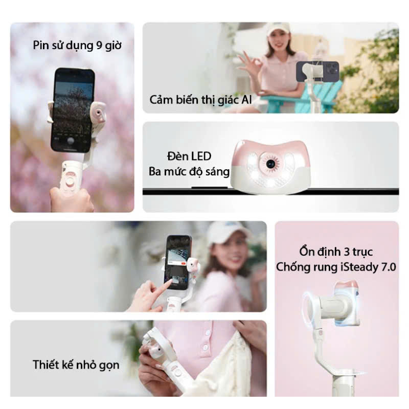 - Thiết kế chống rung 3 trục, quay phim ổn định: Gimbal Hohem iSteady V2S Kit cấu tạo từ hệ thống 3 trục có khả năng xoay chuyển linh hoạt theo nhiều góc độ khác nhau. Cộng thêm sự trợ giúp của thuật toán chống rung iSteady 7.0, phiên bản đảm bảo hạn chế sự rung lắc tối ưu để mang đến chất lượng sắc nét trong từng chi tiết.