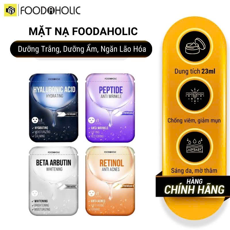 Mặt Nạ Hỗ Trợ Dưỡng Trắng, Dưỡng Ẩm, Ngăn Lão Hóa Foodaholic Mask 23ml là dòng mặt nạ thuộc thương hiệu Foodaholic đến từ Hàn Quốc. Với công thức chứa các “hoạt chất vàng” giúp cải thiện mọi vấn đề về da một cách hiệu quả, nhanh chóng