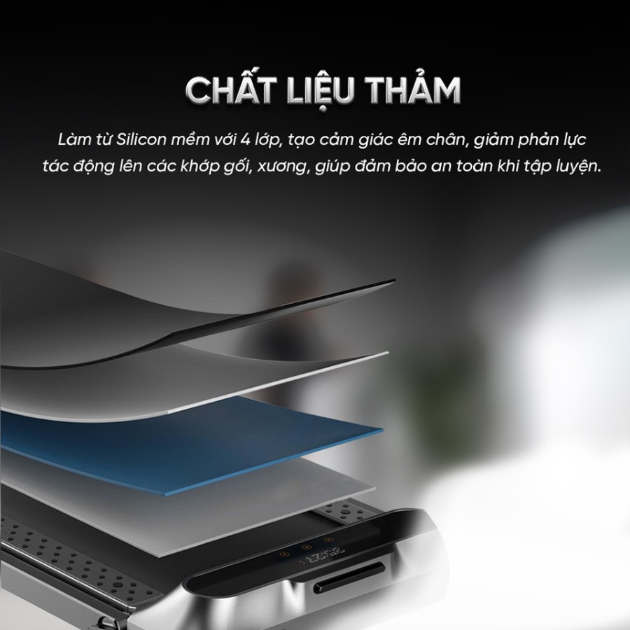 - Thảm chạy 4 lớp: Chống trơn trượt, giảm tác động lên đầu gối.