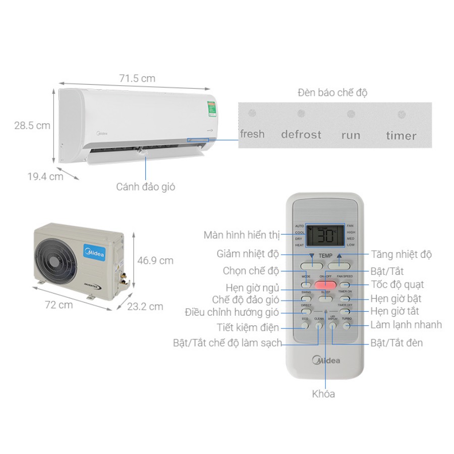 - Midea MAFA-09CDN8 có thiết kế tinh giản, hiện đại, sắc màu trắng thanh lịch giúp dàn lạnh dung nhập vào không gian sống của gia đình hài hòa.