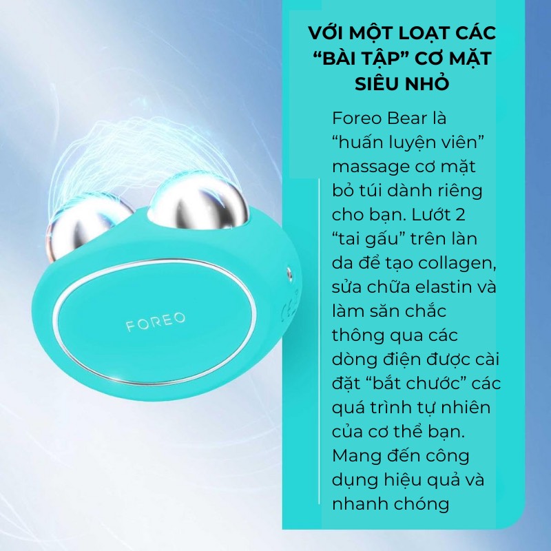 Máy Massage Nâng Cơ Mặt Foreo Bear Màu Xanh Mint hỗ trợ cho làn da của bạn trở nên săn chắc và tươi trẻ hơn. Đây là thiết bị massage nâng cơ da của Foreo thế hệ mới tích hợp cực kì nhiều tính năng hiện đại, cung cấp một phương pháp cho các dấu hiệu tuổi tác trên da bao gồm các đường nhăn, nếp nhăn và da chảy xệ, mất độ săn chắc…