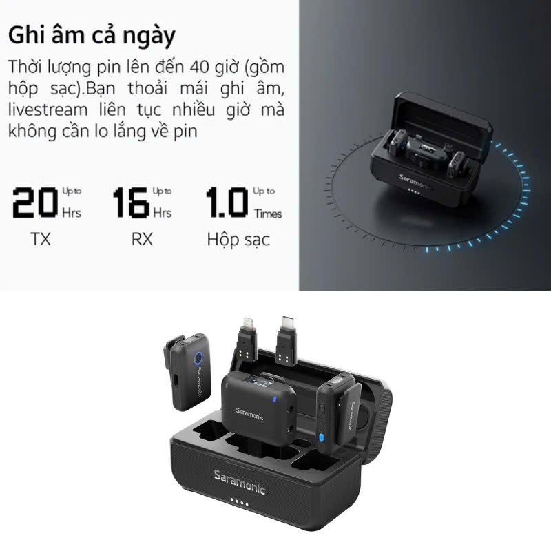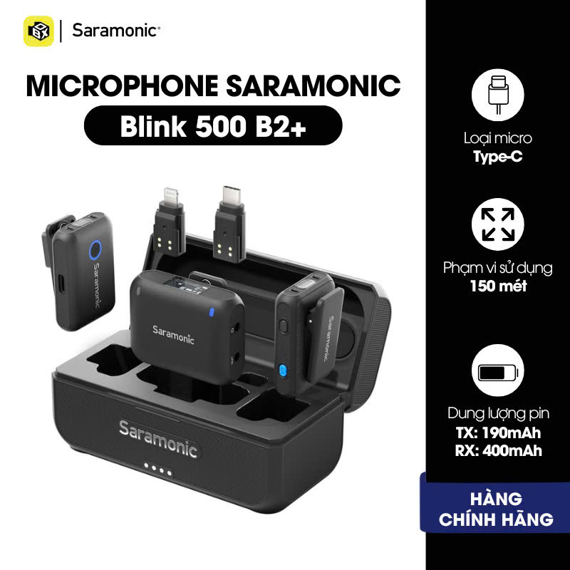 Microphone Saramonic Blink 500 B2 Plus có tần số 2.4 GHz, phạm vi hoạt động lên tới 150m, tích hợp pin 1250mAh sử dụng lâu dài, bền bỉ và hỗ trợ sử dụng đầu sạc USB Type-C. Ngoài ra, sản phẩm nhỏ gọn thích hợp sử dụng cho nhiều nhu cầu sử dụng khác nhau từ phát trực tiếp, vlogging,…
