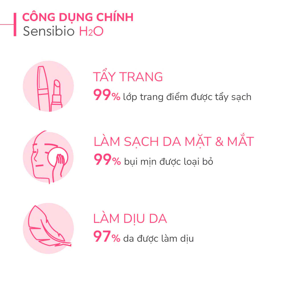 • Các hạt micelle trong Sensibio H2O tương tự thành phần tự nhiên của lớp mang hydrolipid trên da, giúp làm sạch da nhẹ nhàng, loại bỏ hoàn toàn bụi bẩn và lớp trang điểm.