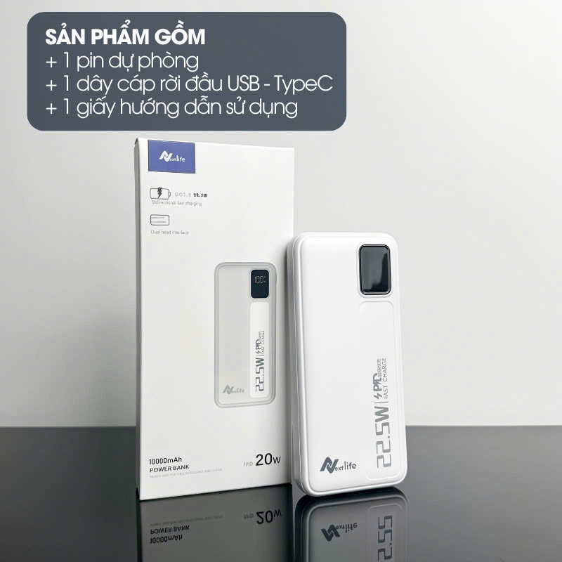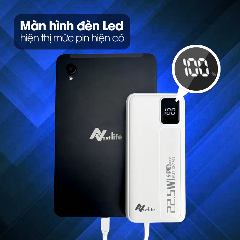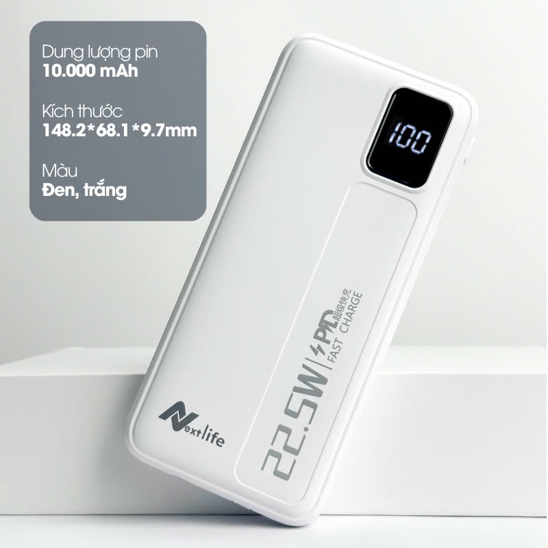 Nextlife CK – 020 có chức năng sạc nhanh 22,5W dung lượng 10000mAh, tích hợp dây cáp tiện lợi 2 đầu ra sạc USB cho iPhone và Android
