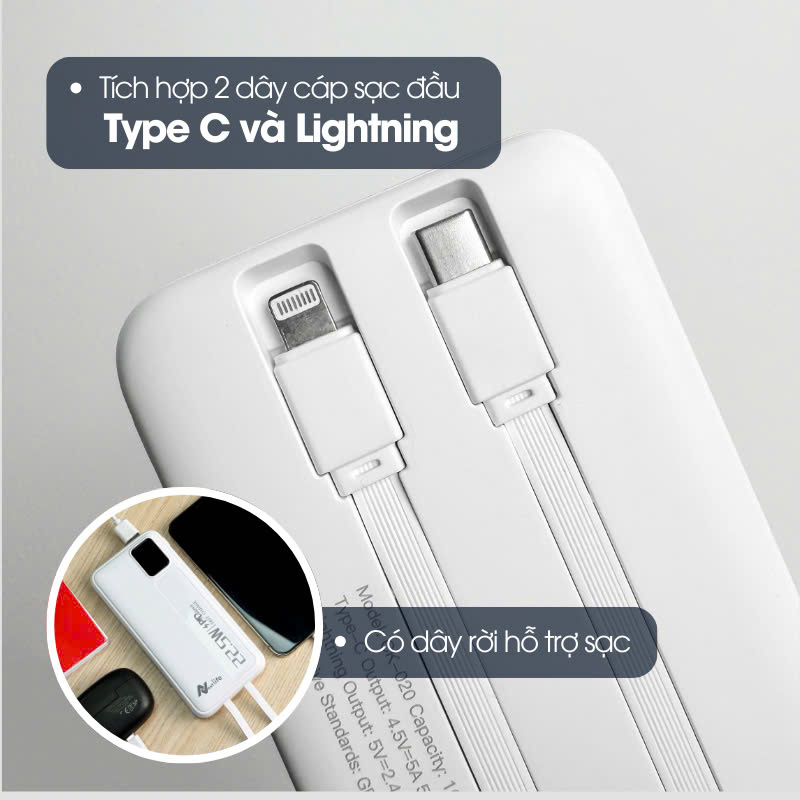 • Tích hợp 2 dây sạc đầu Type C và Lightning