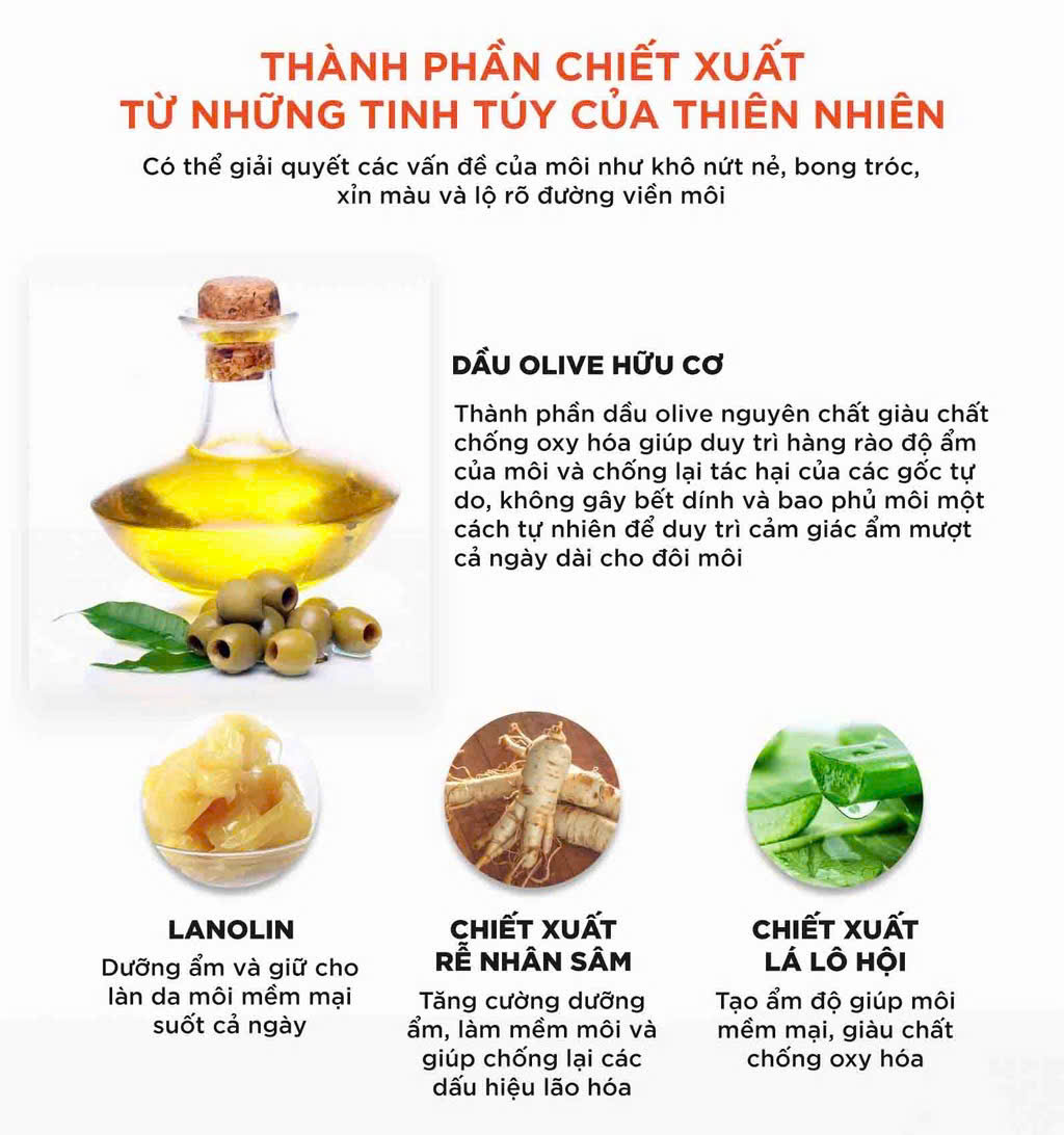 - Ngăn ngừa các dấu hiệu lão hóa, hỗ trợ ngừa thâm môi hiệu quả, làm hồng môi và khắc phục tình trạng nứt rãnh môi.