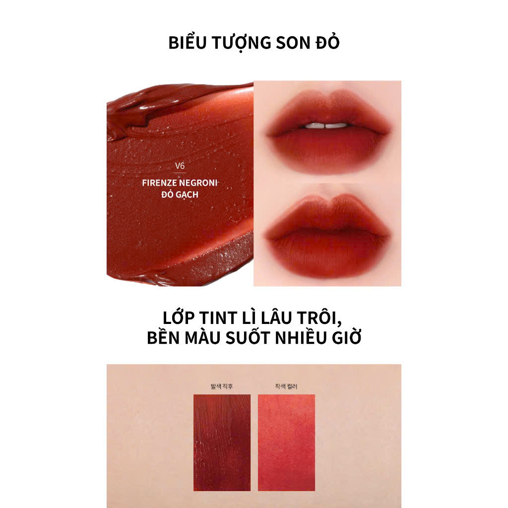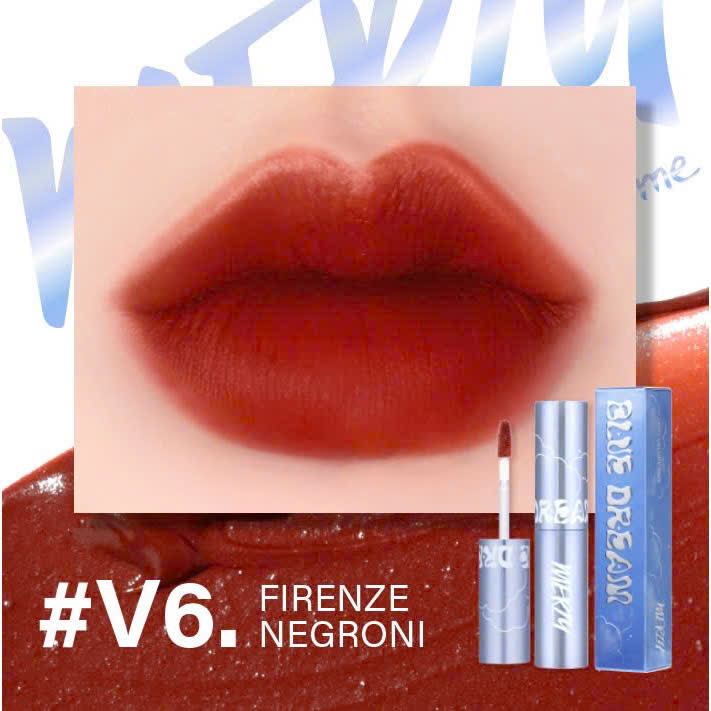 - Tone màu đỏ huyền thoại phù hợp với mọi tông da của người tone da Việt và hợp mọi phong cách. Lớp tint cuối V6 Blue Dream chuẩn màu son đầu
