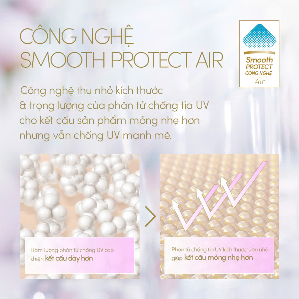• Công Nghệ Smooth Protect Air giúp thu nhỏ kích thước & trọng lượng của các phân tử chống tia UV thành kích thước nano siêu nhỏ, cho mỏng nhẹ hơn, giảm tối đa tình trạng bết dính, hạn chế áp lực lên làn da nhạy cảm nhưng vẫn đảm bảo khả năng chống tia UVA/B và bụi ô nhiễm thật ưu việt!