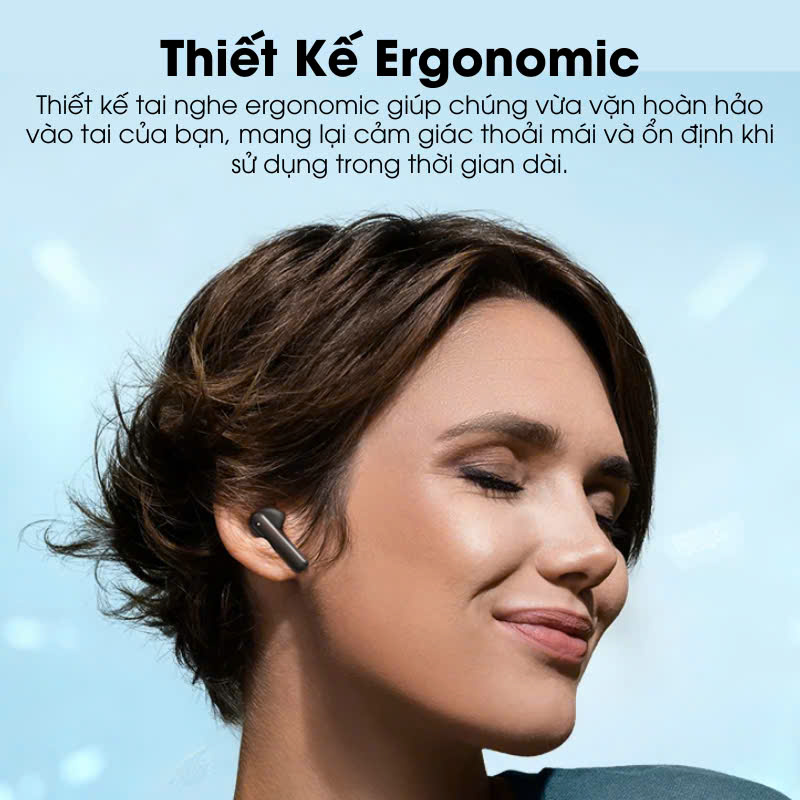 - Thiết kế tai nghe ergonomic giúp chúng vừa vặn hoàn hảo vào tai của bạn, mang lại cảm giác thoải mái và ổn định khi sử dụng trong thời gian dài.