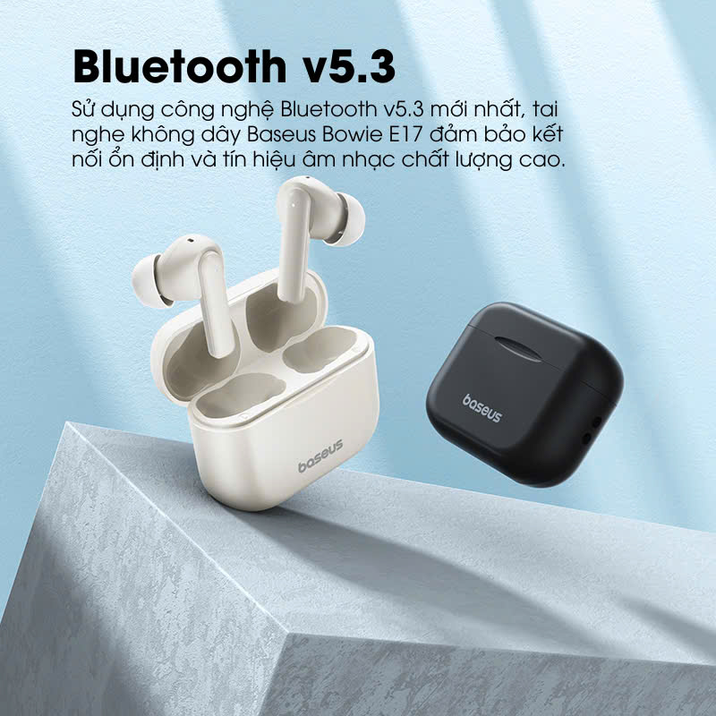 - Sử dụng công nghệ Bluetooth v5.3 mới nhất, tai nghe không dây Baseus Bowie E17 đảm bảo kết nối ổn định và tín hiệu âm nhạc chất lượng cao.
