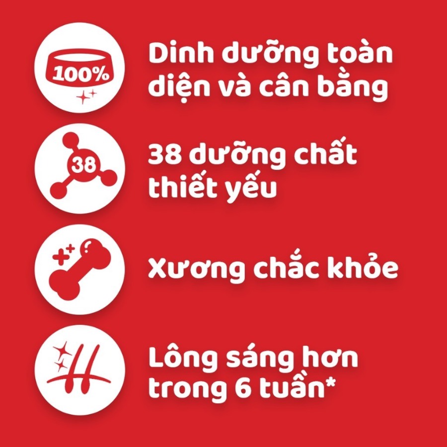 - Lông mượt da khỏe – Thức ăn khô dành cho chó được chế biến bằng sự kết hợp độc đáo của axit linoleic và kẽm, cung cấp cho chó của bạn đủ dưỡng chất để có làn da khỏe mạnh và bộ lông bóng mượt trong 6 tuần