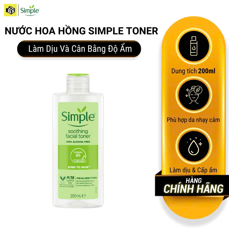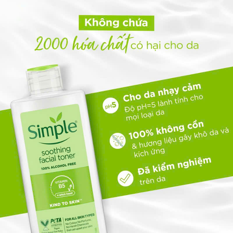 - Nước cân bằng Simple Soothing Toner chứa Vitamin B5, chiết xuất Hoa cúc La Mã Chamomile và Allantoin giúp làm dịu da và cấp ẩm tức thì, mang đến một làn da mềm mại, mịn màng mà không để lại cảm giác nhờn dính.
